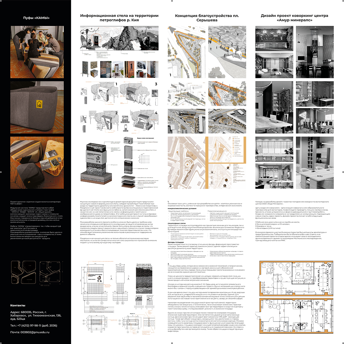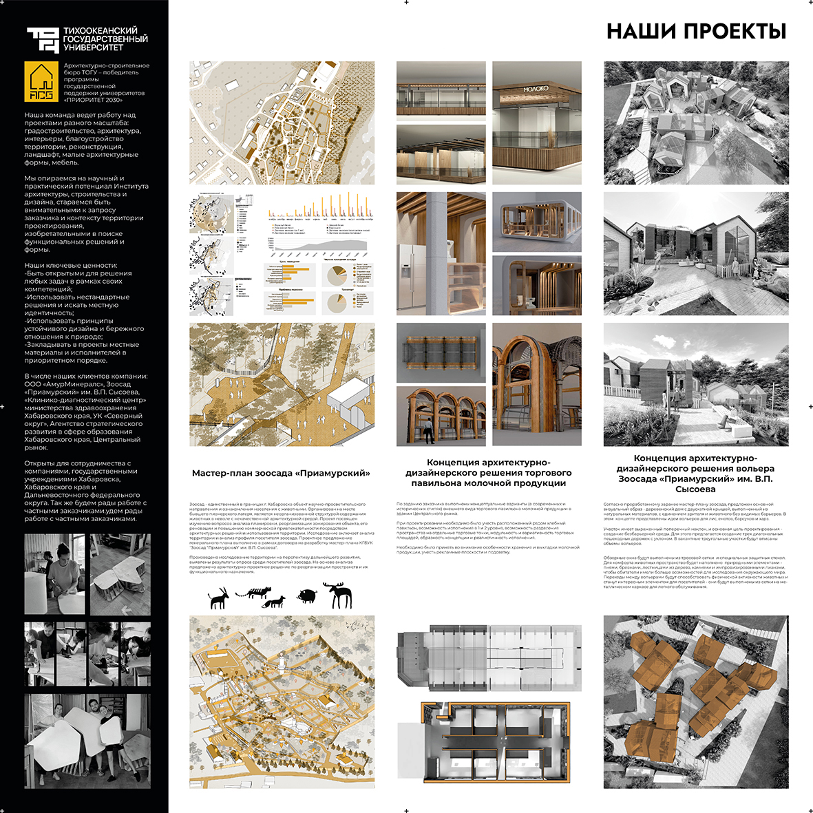 Мы опираемся на научный и практический потенциал Института архитектуры, строительства и дизайна, стараемся быть внимательными к запросу заказчика и контексту территории проектирования, изобретательными в поиске функциональных решений и формы.